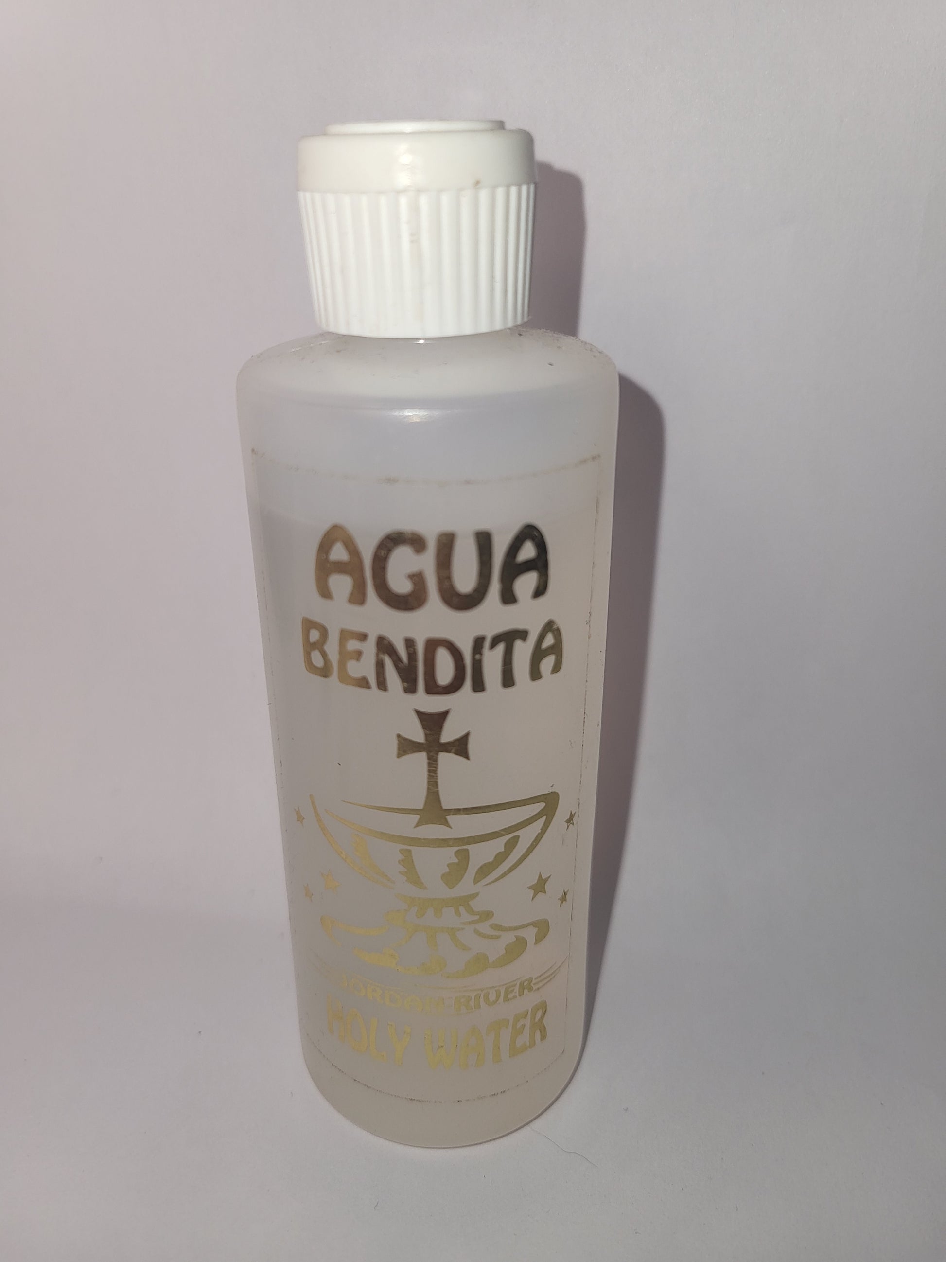 Authentic Agua Bendita bottle, marked with sacred cross imagery. Used for blessings, cleansing, and protection rituals.